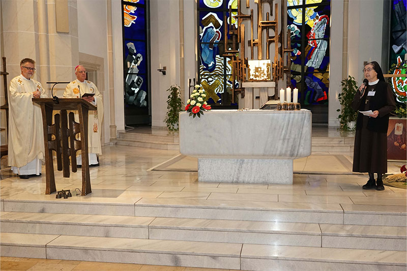 Schwester M. Angela Benoit, Provinzoberin der Franziskanerinnen Salzkotten, begrüßte am Samstag in der Mutterhauskirche in Salzkotten die Teilnehmerinnen und Teilnehmer des Ordenstages im Erzbistum Paderborn. Den Gottesdienst mit den Ordenschristen feierten Pater Siegfried Modenbach SAC, Vorsitzender der Paderborner Ordenskonferenz (1.v.l.) und Weihbischof Matthias König. Foto: Michael Bodin / Erzbistum Paderborn