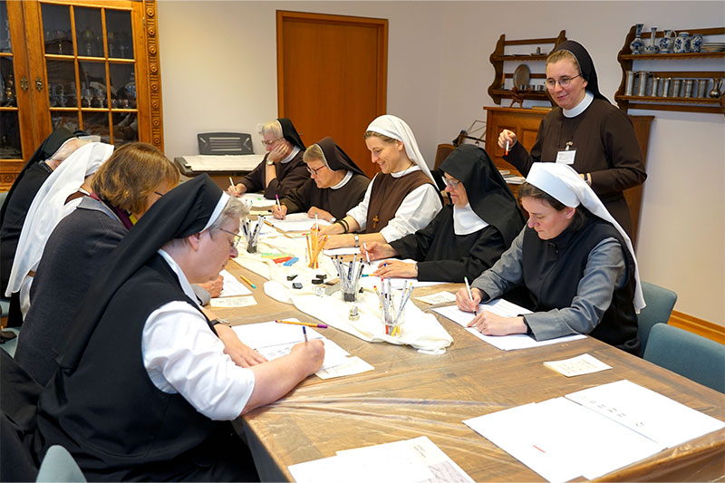 Auch kreative Workshops standen auf dem Programm des Ordenstages im Erzbistum Paderborn. Hier ein Bild aus dem Workshop „Handlettering, die Welt der schönen Buchstaben“, der von Schwester M. Lucia Liebenau (stehend) geleitet wurde. Foto: Michael Bodin / Erzbistum Paderborn